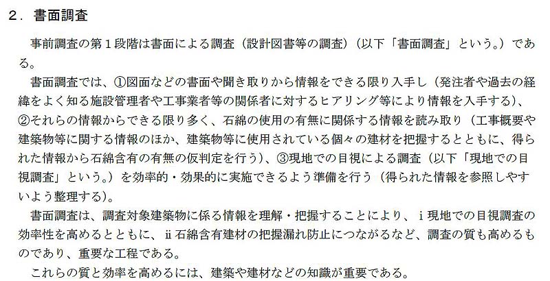 事前調査は「書面調査」「目視調査」「分析調査」の3つの工程からなり、その中の「書面調査」の方法について説明します。