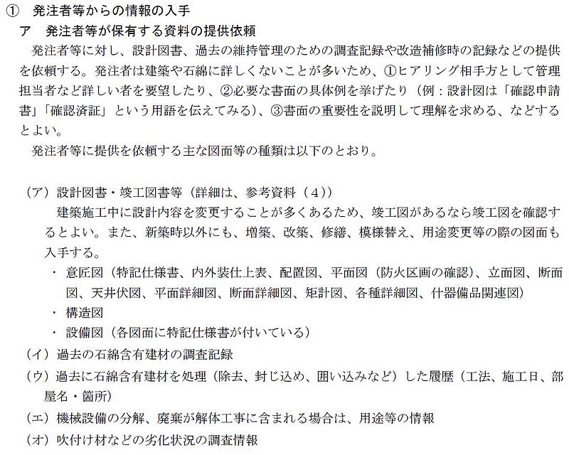 ほとんどは、調査目的である改修、解体工事の設計図書、特記仕様書ではないでしょうか?