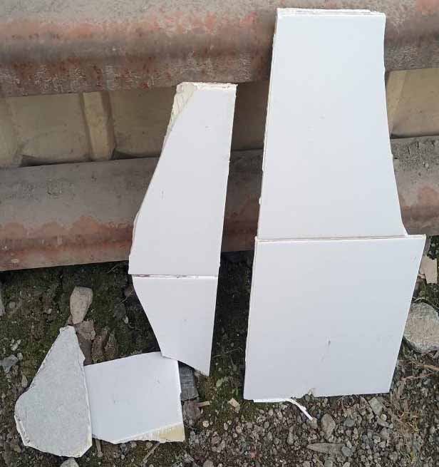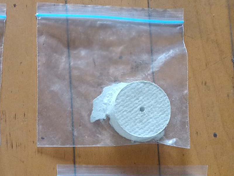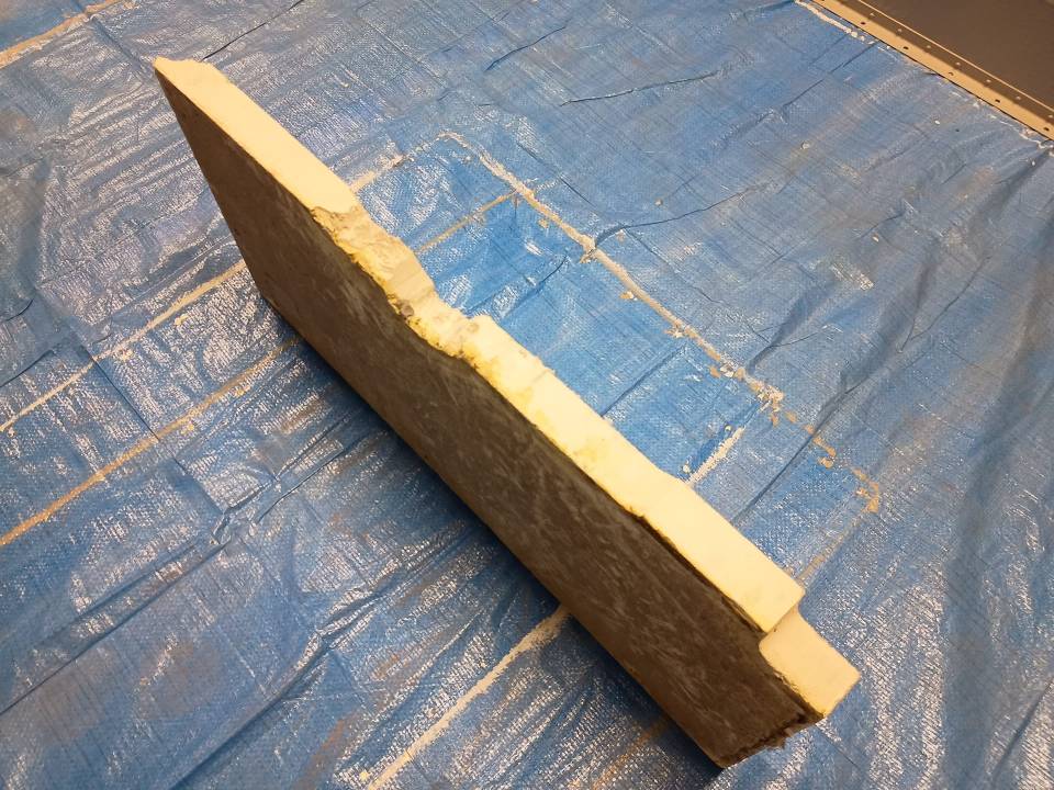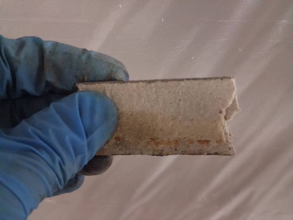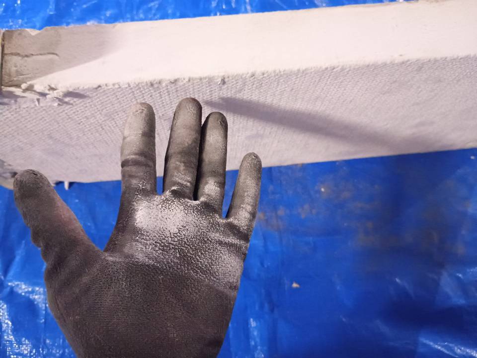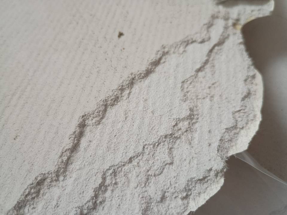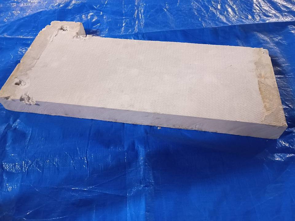 - 特徴:白色。厚みがあるが軽い。同じ大きさの材木くらいの重さ。脆い。触ると白い粉が付く。