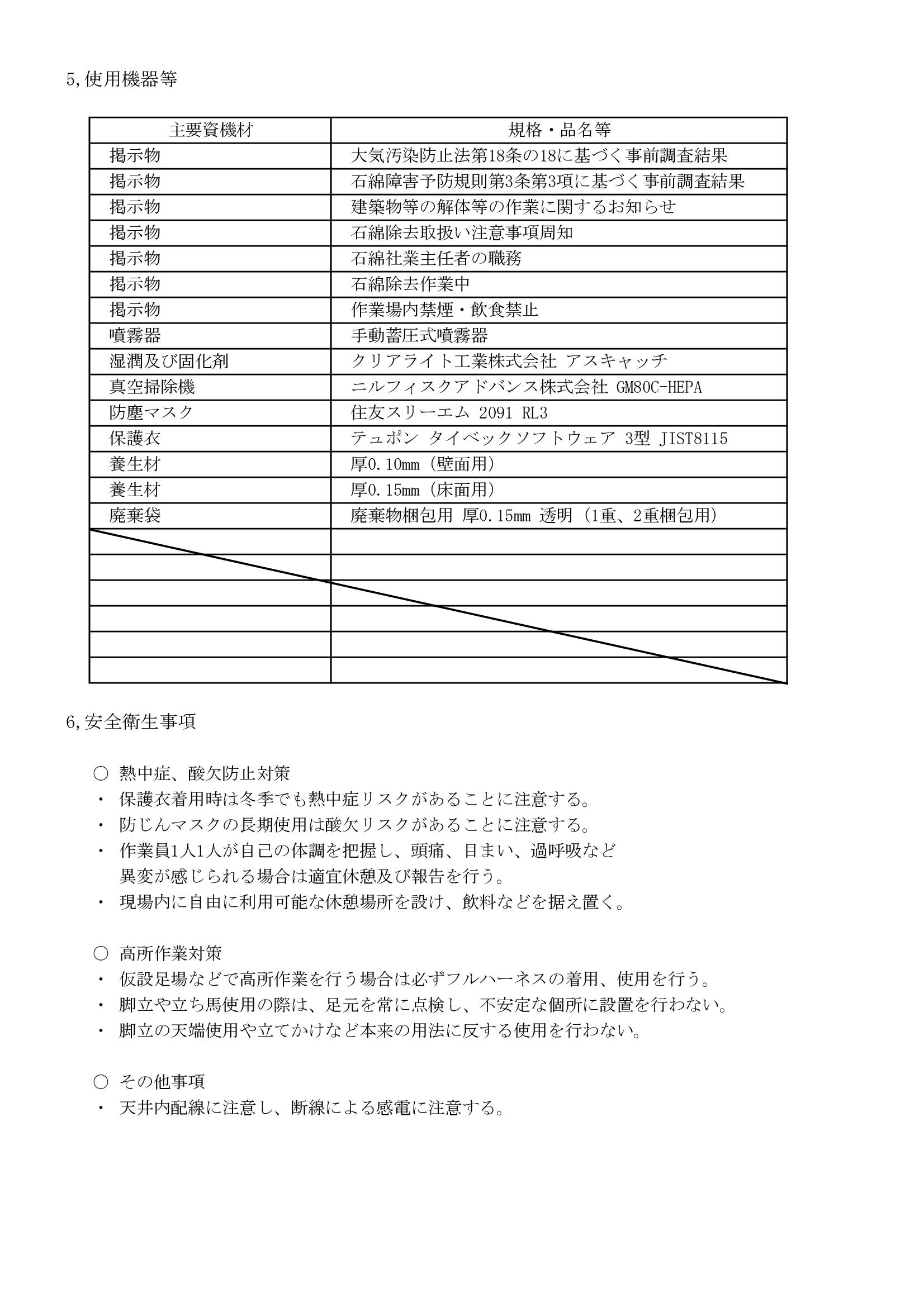 具体的な使用資機材の記載をここで行います。