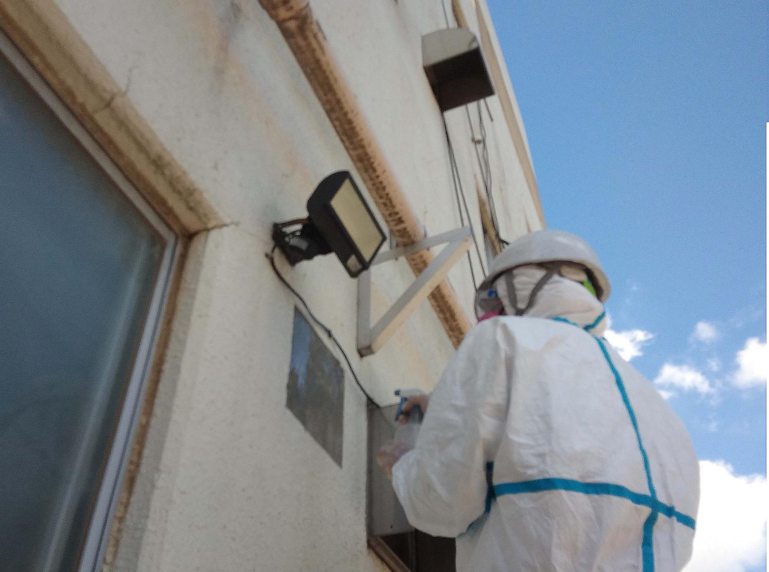 試料採取は「アスベストかもしれない建材を切断・穿孔する作業」ですので、飛散防止剤噴霧や散水など事前の飛散防止処理が必要です。
