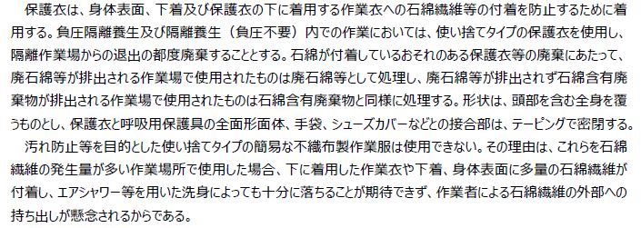 • 作業衣、作業着は「表面が平滑で粉じんが付着しにくい」「粉じんが内部に侵入しないよう、ポケットなどが最小限」という規定があり、何でもよいわけではない。