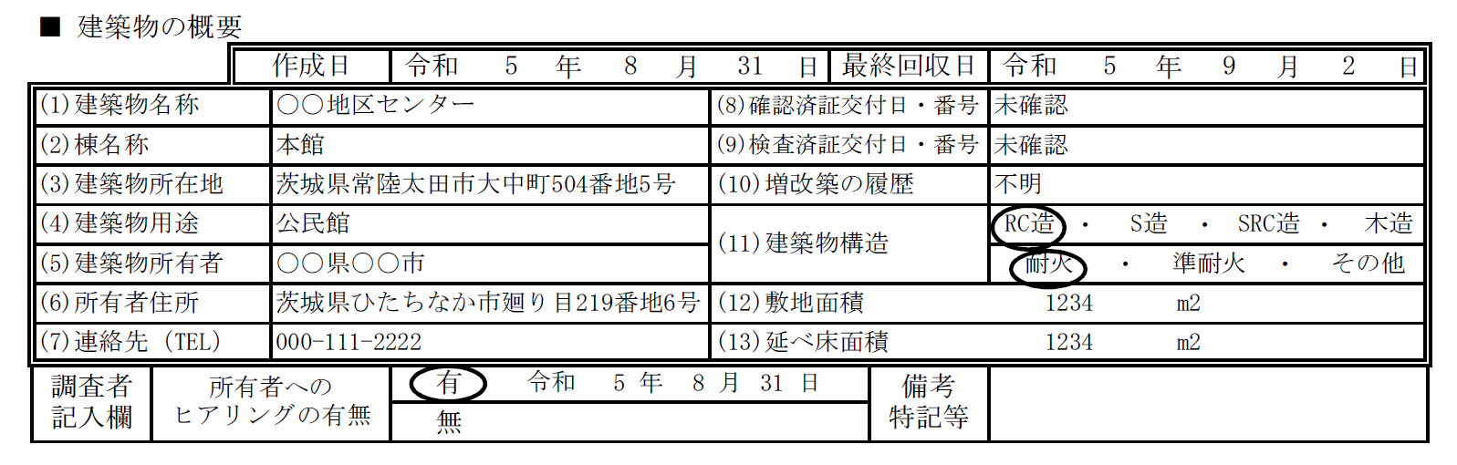 『建築物の概要』欄の当該箇所は、基本的に建築物の所有者しかわからない情報が多く含まれるため、正しい情報が必要な場合は、所有者に記載を依頼しましょう。