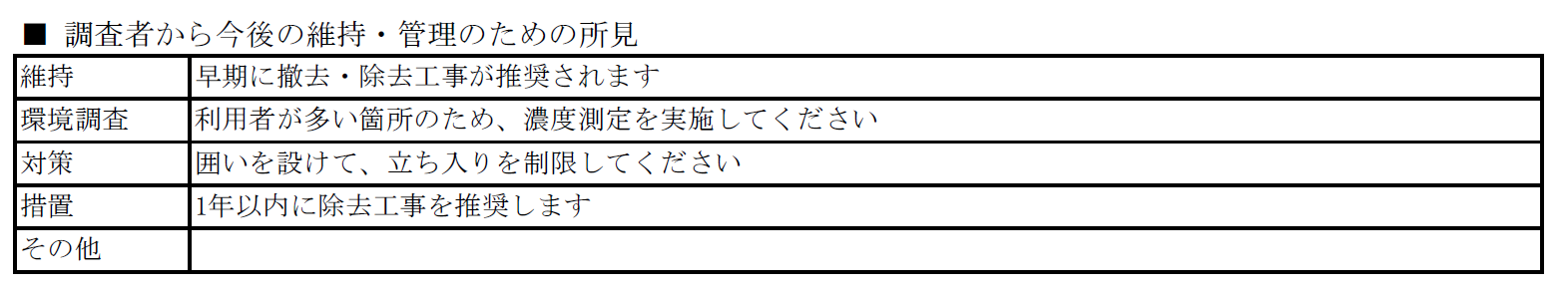 - 除去工事の要否や今後の点検について、所見を具体的に記載する。
