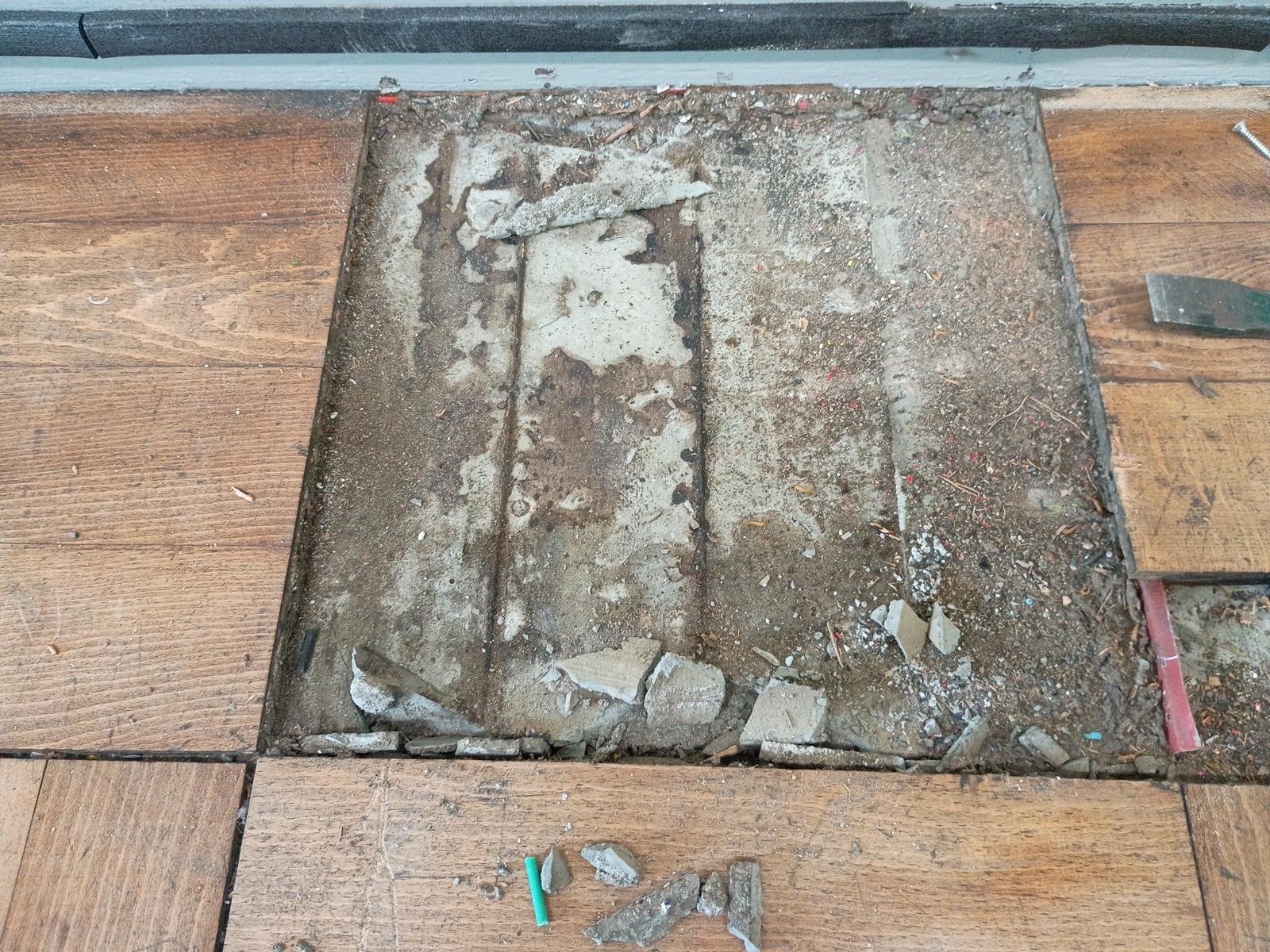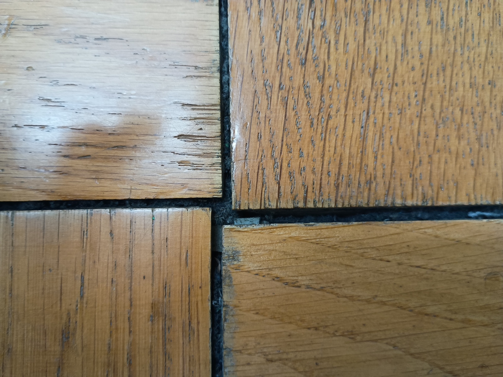 古いフローリングブロックは、木材そのものの乾燥収縮で痩せ、フローリング同士の隙間が開いているため、そこから覗けばわかることがあります。