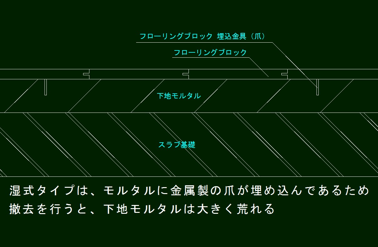 フローリングブロックには、主に古い『湿式』と、現在主流の『乾式』という2種類があり、改修を依頼されるような場所は、多くの場合古い『湿式』であることが多いです。