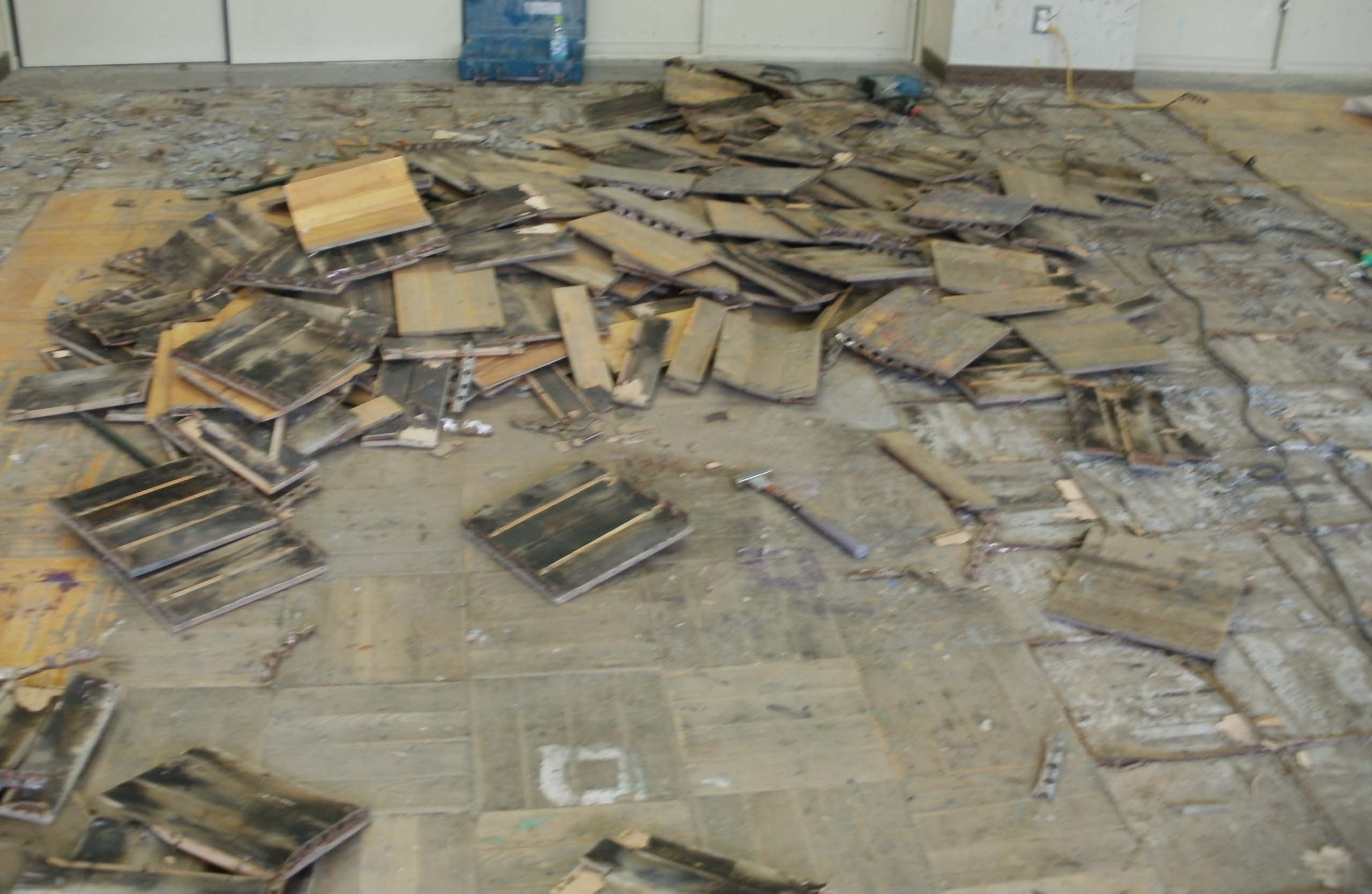 撤去前の現状確認をしたのち、既存フローリングブロックを撤去していきます。