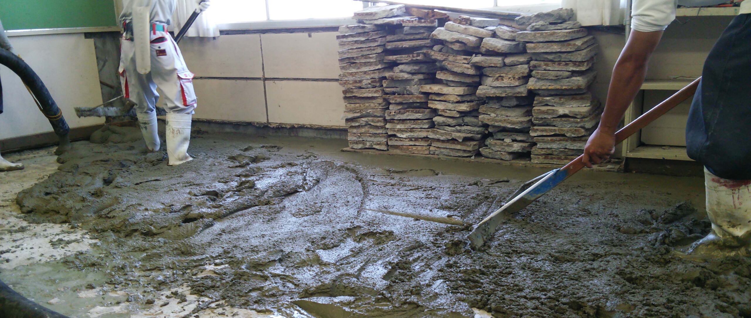 仮に教室全面くらいの面積の場合は、先述のように10トン規模のモルタルが必要になるため、ミキサー車やポンプ車の手配が必要になると思います。