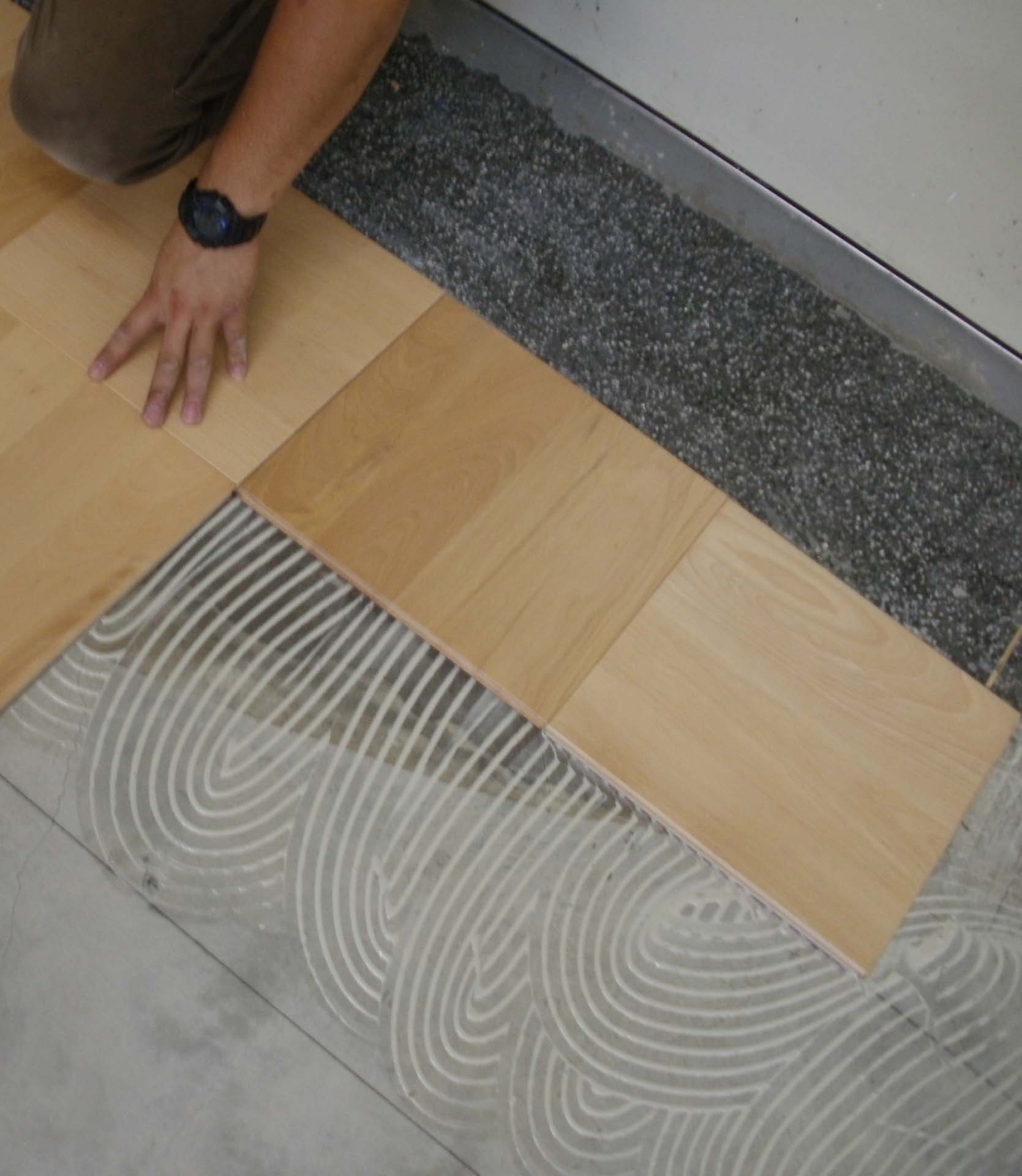 平滑な下地を仕上げたら、ウレタンボンドを使ってフローリングブロックを並べていく作業です。