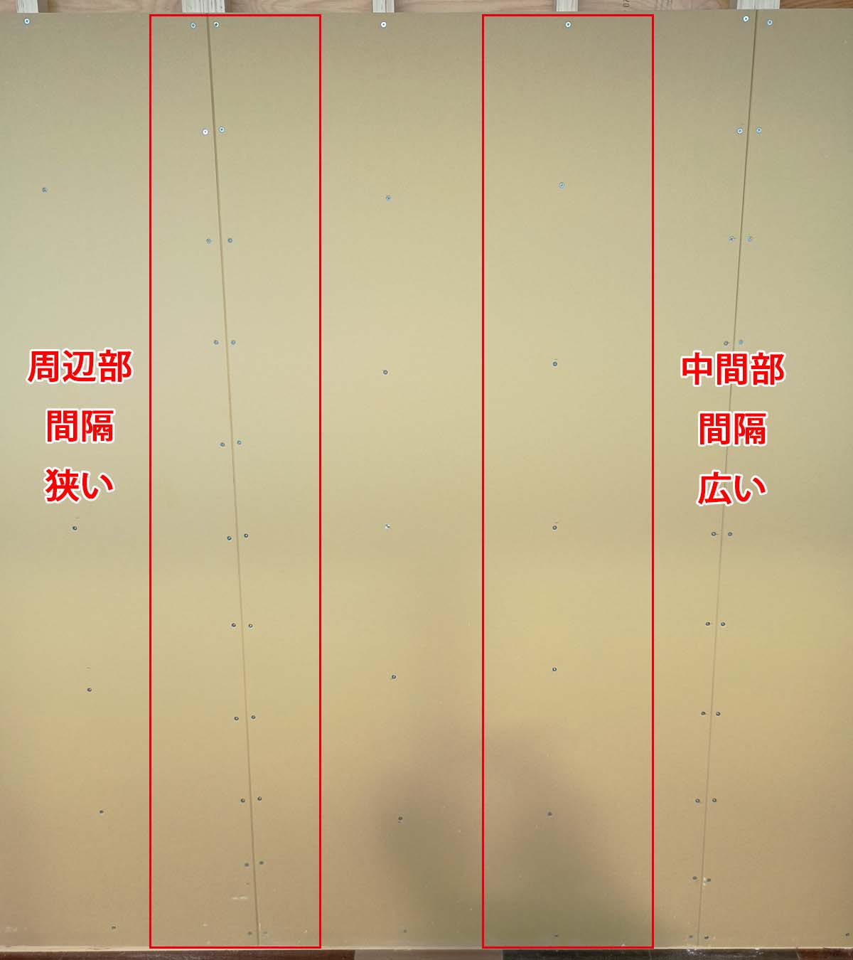 標準仕様書を参照すると、周辺部と中間部で留付け間隔が違っていることに気づきます。