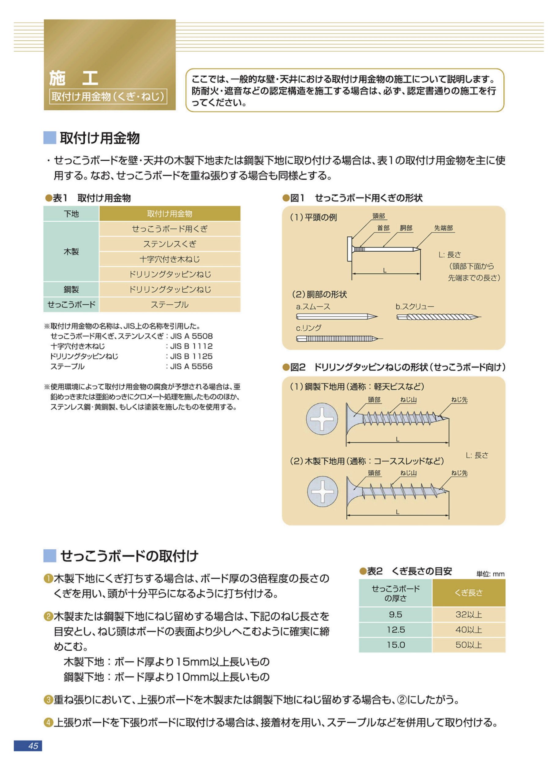 石こうボードのようなメーカー製品の場合は、メーカーカタログに施工方法がしっかり記載されているので、それを参照するのが確実です。