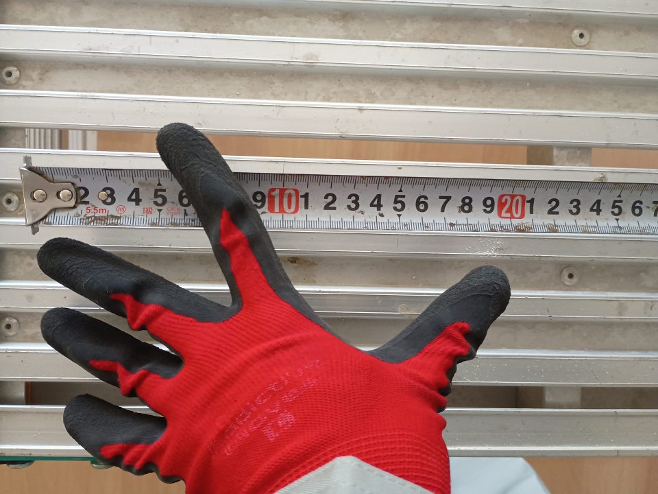 上の写真の例だと、親指から中指の先まででだいたい200mm。