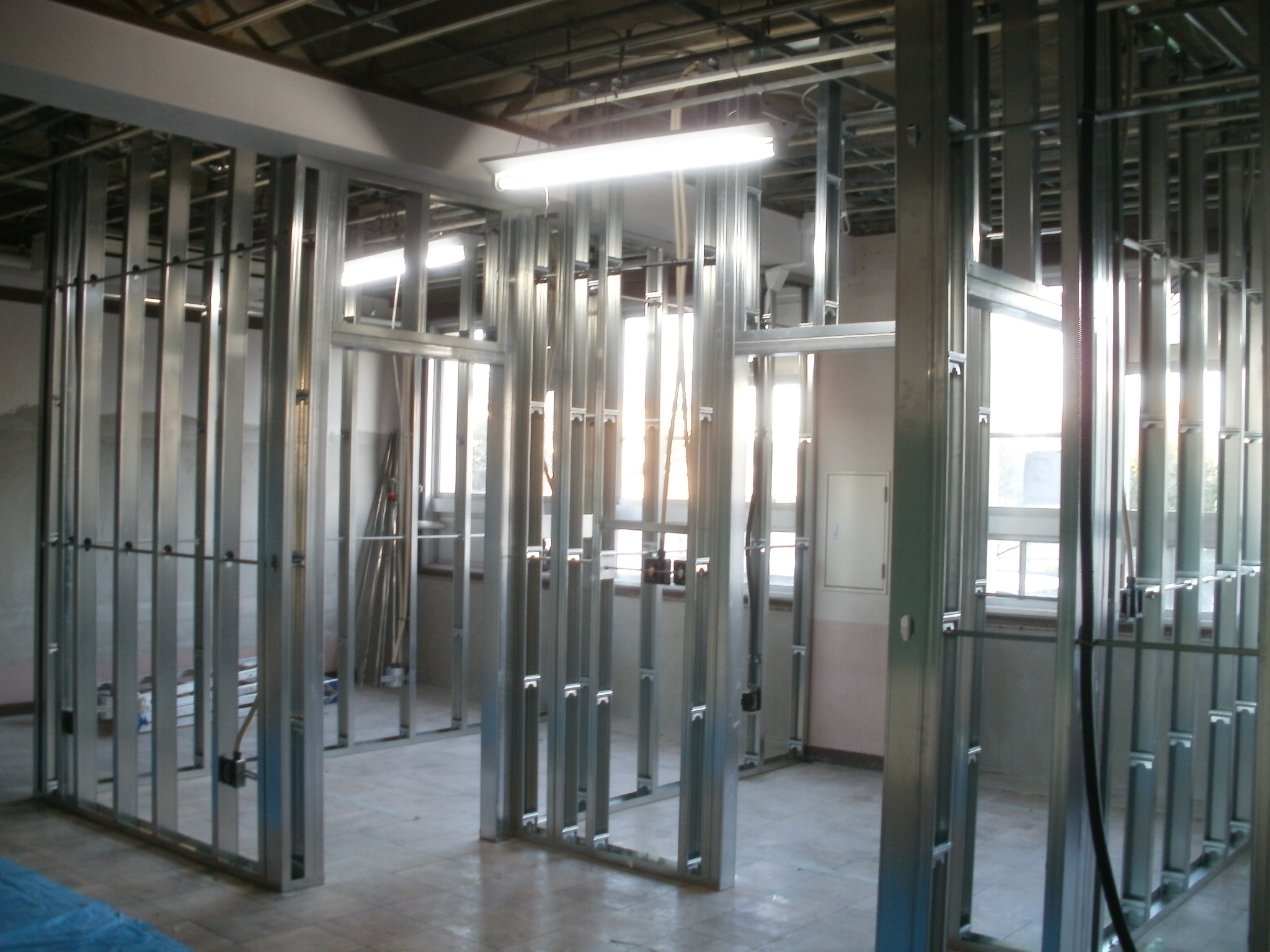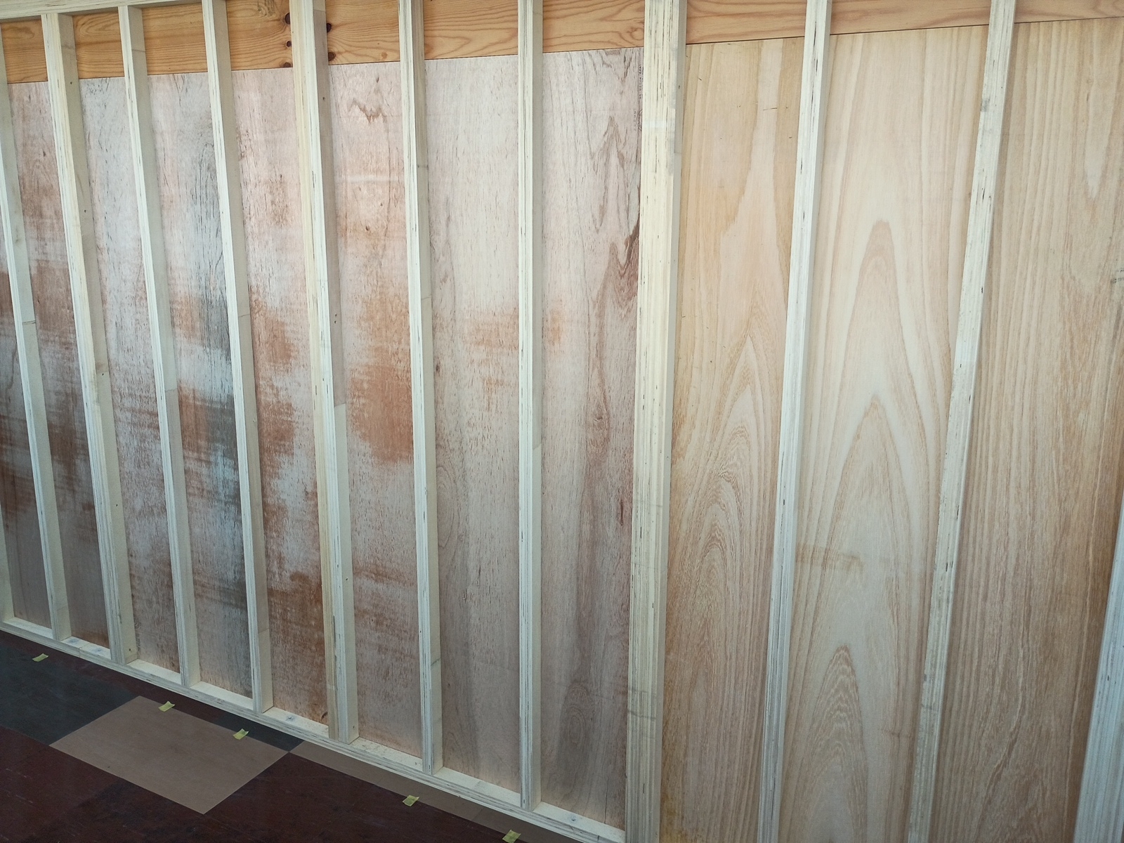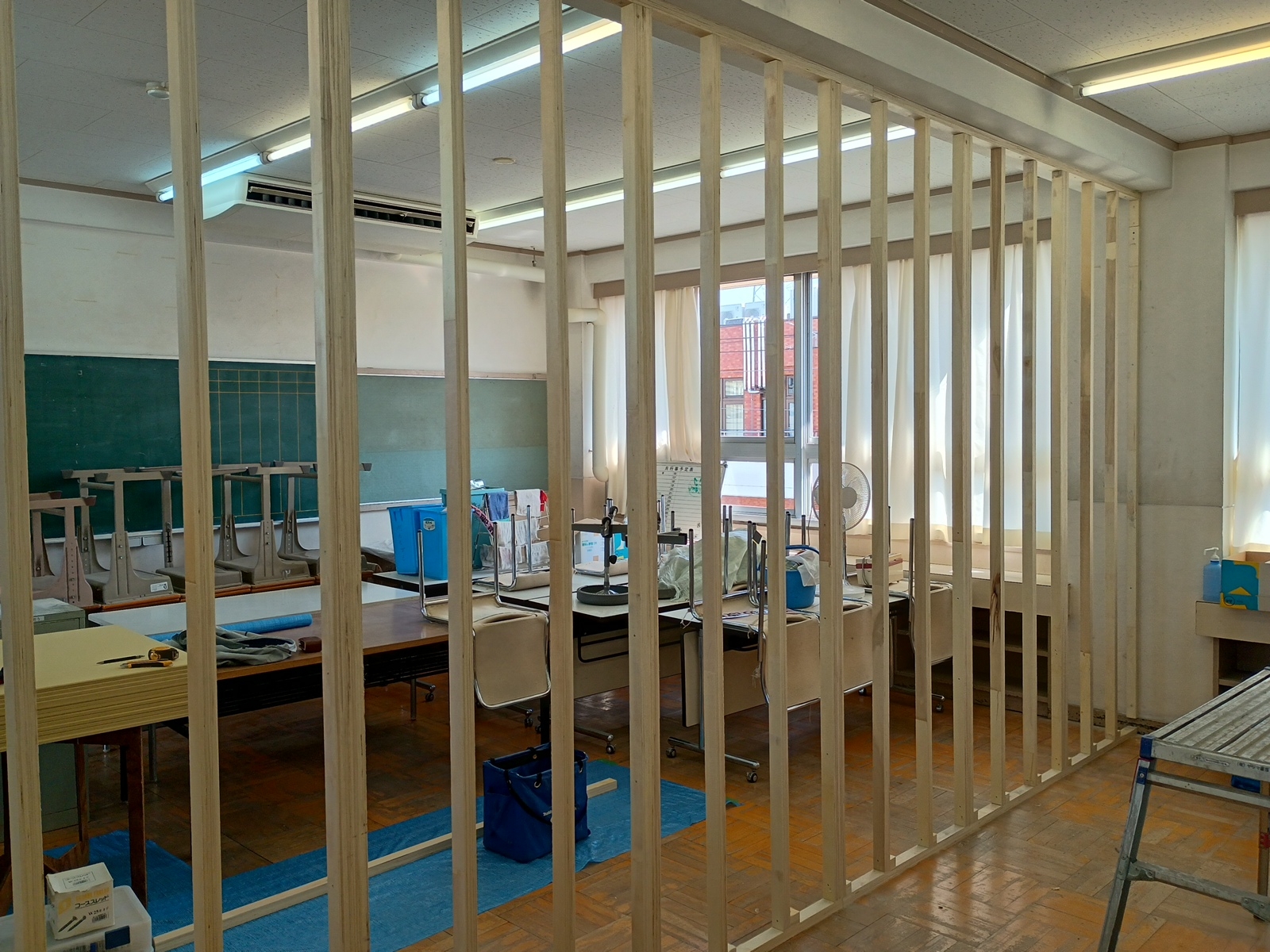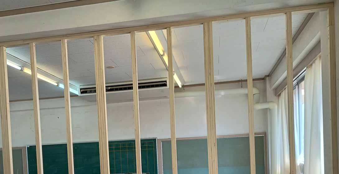 アルミパーティションや軽量鉄骨を使うより加工性が良く、工期が短く、さらに材料もすぐ手に入りやすいため、小規模の案件でよく使われる方法だと思います。