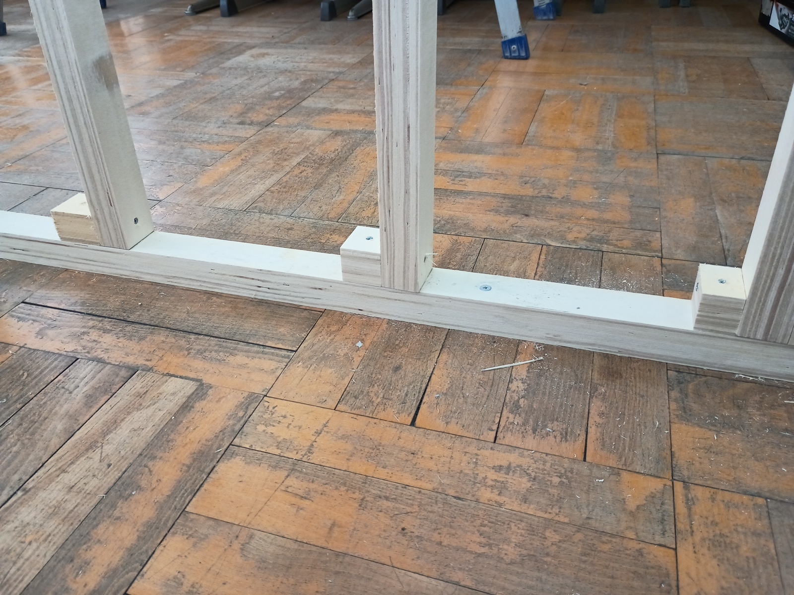 天井面にもさいころブロックを作れば安定度が増すかもしれませんが、床面が既に固定されている場合は手を放しても間柱が倒れる事はありません。