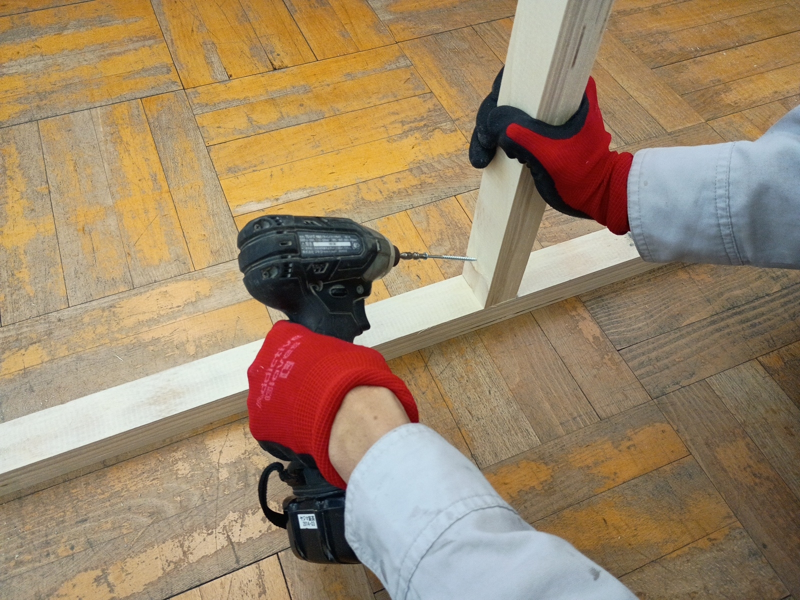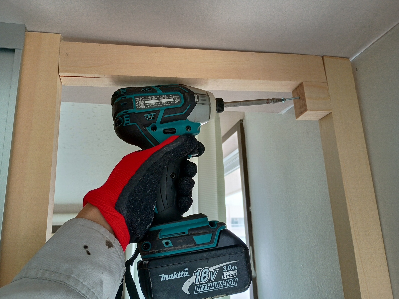 軽量鉄骨のように、先にスタッドを立ててから、後でビス固定を行えれば楽なのですが、木材は直方体のため、そのような事ができません。