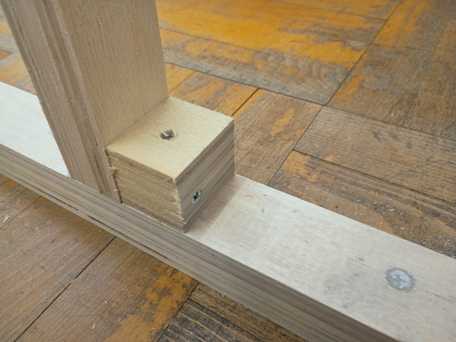 『片方の手で押さえて』『もう片方の手でビス止め』という動作はどうしても不安定ですが、さいころブロックを先に固定しておけば、後はそれに間柱を合わせてビス止めするだけなので簡単です。