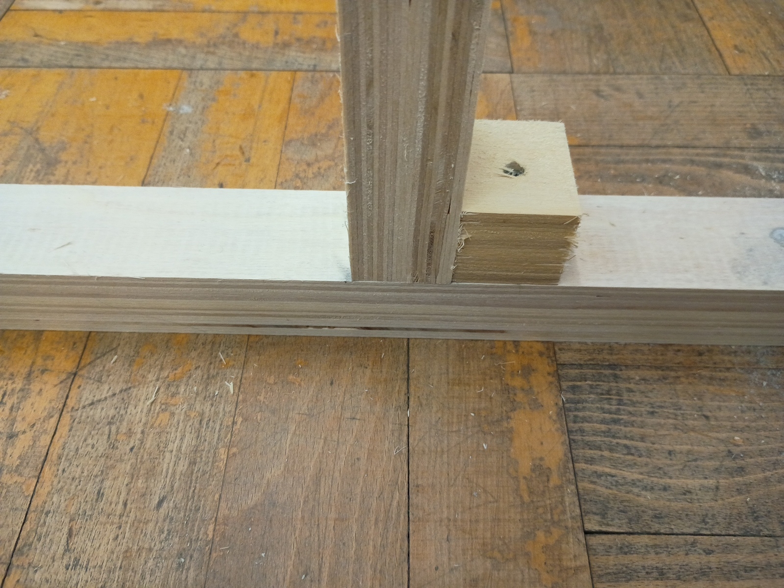 ビスの斜め打ちを回避するための解決策として、さいころ状の小さなブロックを作り固定し、それに間柱材をビス止めする方法があります。